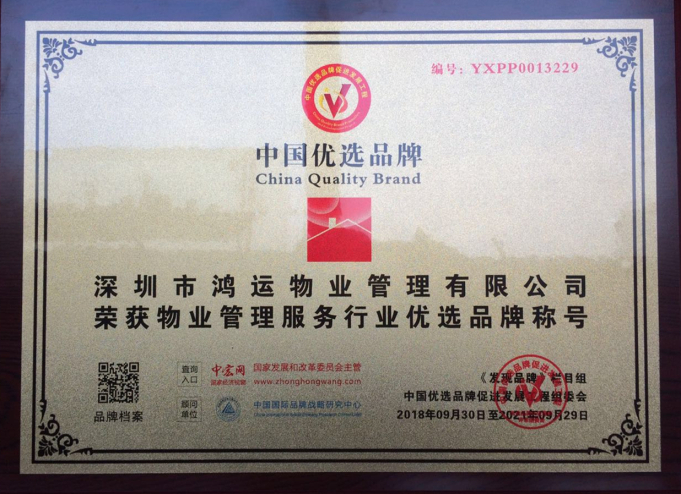 2018年9月30日,鴻運物業(yè)被評為物業(yè)管理服務行業(yè)優(yōu)選品牌。中國優(yōu)選品牌促進發(fā)展工程是為了深切貫徹黨中央、國務院和國家有關部委關于深化經濟體制改革,加強中國民族品牌建設的若干文件精神,響應中國廣大企業(yè)創(chuàng)建中國優(yōu)質品牌的強烈要求,由社會各級權威媒體組織發(fā)起,并與中央電視臺聯(lián)合創(chuàng)建了《發(fā)現(xiàn)·品牌》欄目,整合現(xiàn)有政策、權威媒體、 網絡資源為中國優(yōu)質品牌提供品牌提升和傳播的一體化窗口。鴻運物業(yè)成功當選,直接證明了鴻運物業(yè)的實力與口碑。 在中國優(yōu)選品牌促進發(fā)展工程官方網站上,可以搜索鴻運物業(yè)查找到相關信息,亦可點擊下方鏈接,直接查看詳情: http://www.cctvfxpp.com/brand/detail/sn-YXPP0013229.html?ref=www